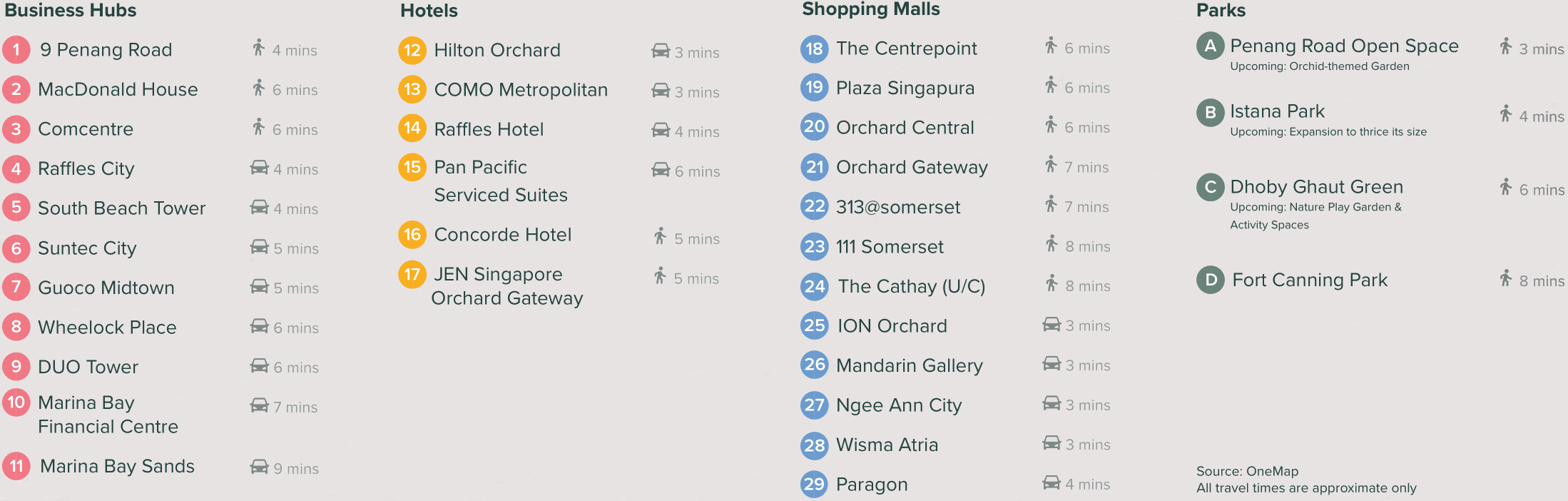The Mass Rapid Transport (MRT) lines provide swift travel across the island, with a mere 5-minute stroll to Dhoby Ghaut Station (serving NSL, NEL, and CCL), or reach Somerset MRT Station (NSL) within a leisurely 6-minute walk.